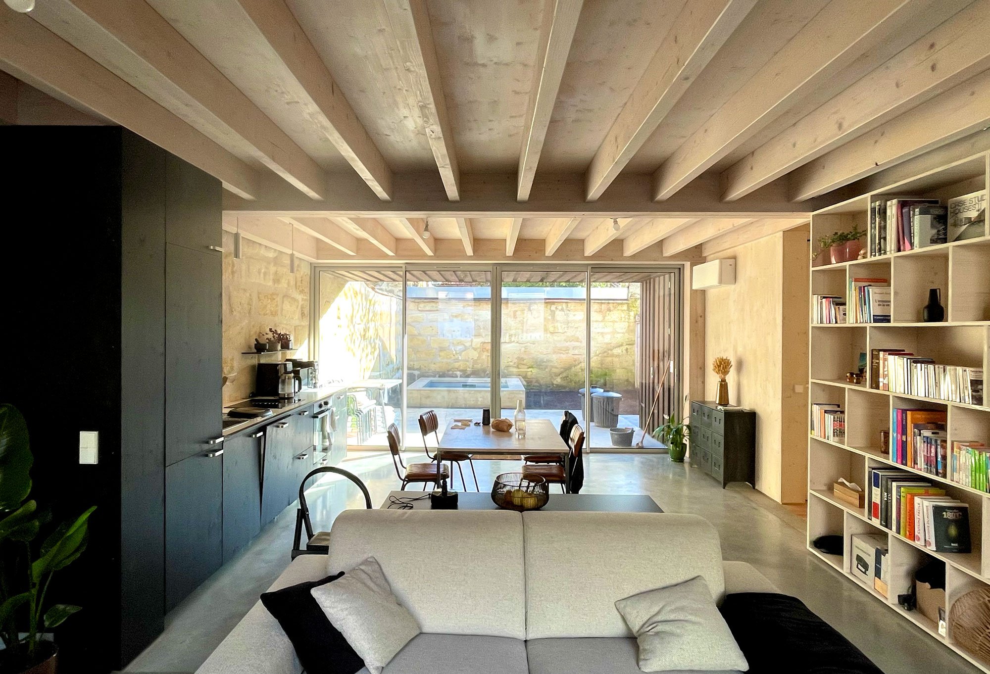En curant l’ensemble pour révéler la pierre et libérer la parcelle des ajouts successifs, un nouveau volume en bois est construit et ouvre la maison sur le cœur d’îlot. Il crée un étage en s’insérant entre les murs en pierre mitoyens et la façade sur rue conservée. Ainsi, le projet parvient à augmenter la surface habitable tout en doublant la surface du jardin intérieur, qui retrouve sa fonction d’origine. Entre minéralité et bois, les volumes traversants dialoguent avec les jardins et le paysage environnant pour offrir une maison lumineuse et ventilée naturellement.