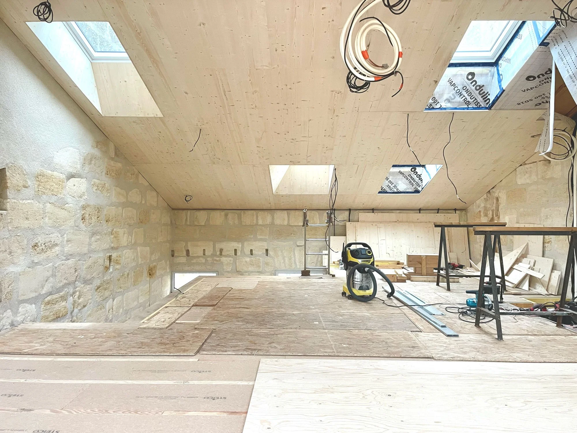 Particularité : Conception et Autoconstruction / déconstruction sélective et valorisation des déchets + construction en pierre, chaux et bois + isolants bio-sourcés et finitions bois