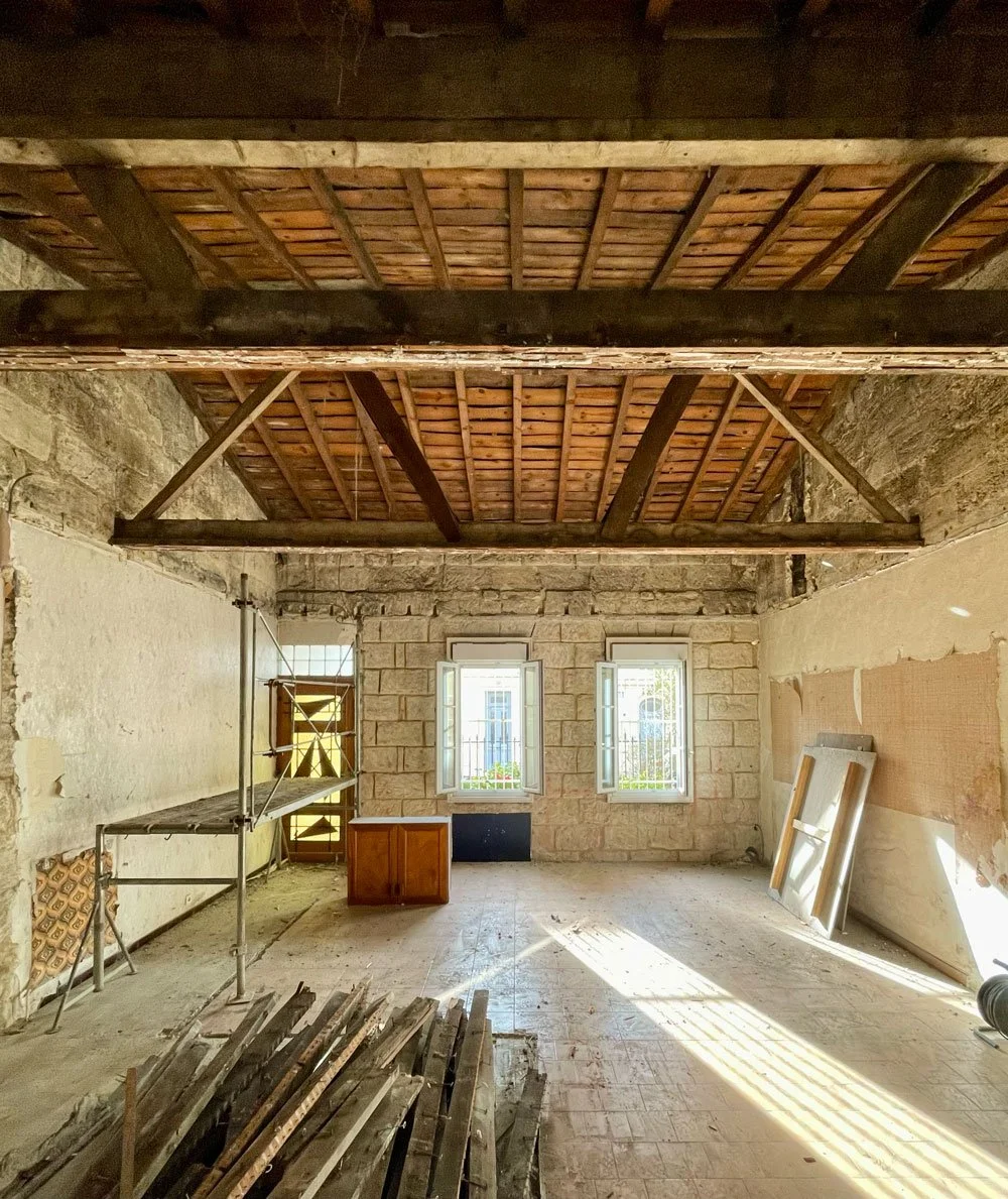 La maison d’origine, de plain-pied, est identifiée comme construction protégée ; sa façade en pierre de 4,5 m de haut est immuable. Face à l’état d’usure avancée du bâti, aux problématiques d’humidité et à l’encombrement de la cour arrière par des dépendances, une réfection complète a été privilégiée.