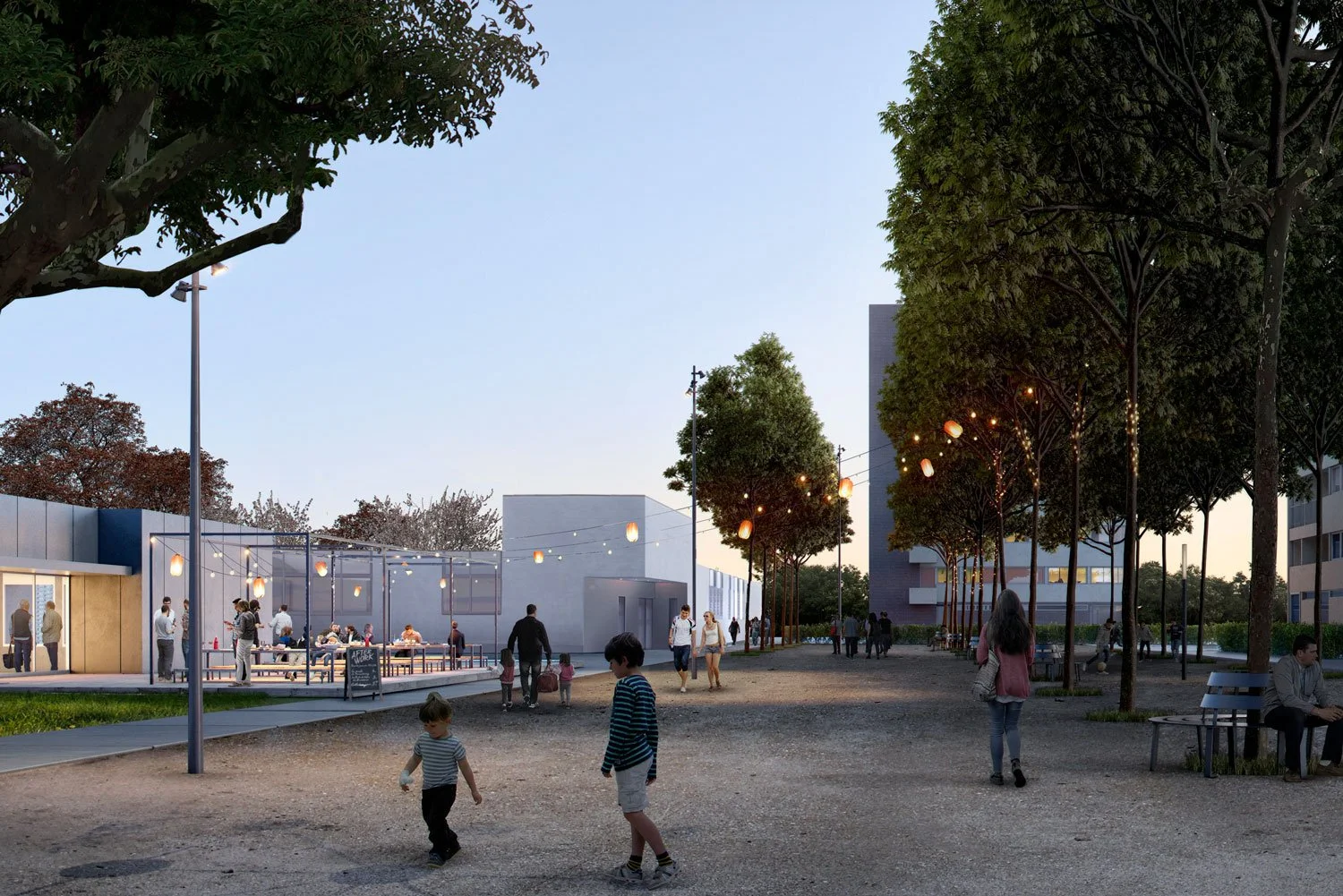 Les aménagements s’appuient sur le grand mail de platanes existant en coeur du quartier, lui-même prolongé au nord et au sud pour connecter l’ensemble des espaces publics périphériques. Ce potentiel remarquable est valorisé et structure le site, où un ensemble de fonctions se greffe (école, jeux, city stade, maison de quartier...).