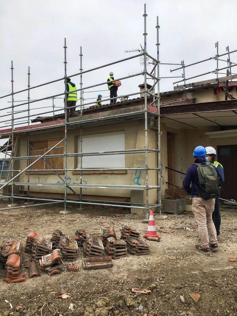 – Le REEMPLOI : contraint par la présence d’amiante et de plomb sur plusieurs ouvrages existants, seuls les couvertures en tuiles, les bois de charpente et des équipements sanitaires ont pu être déposés et reconditionnés pour être réemployés ailleurs.